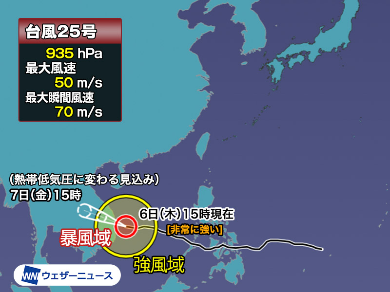 6日(木)15時現在、非常に強い台風25号は南シナ海を西に進んでいます。