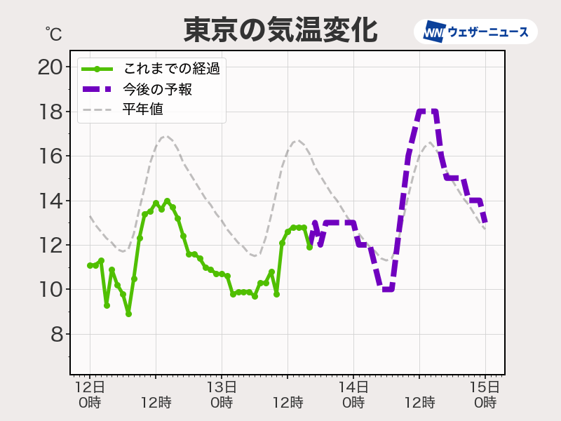 朝はやや冷え込むものの、昼間は今日13日(木)よりも気温が上昇します。西日本や東海では20℃を超える所が多く、関東も20℃近くまで上がって過ごしやすい陽気です。
