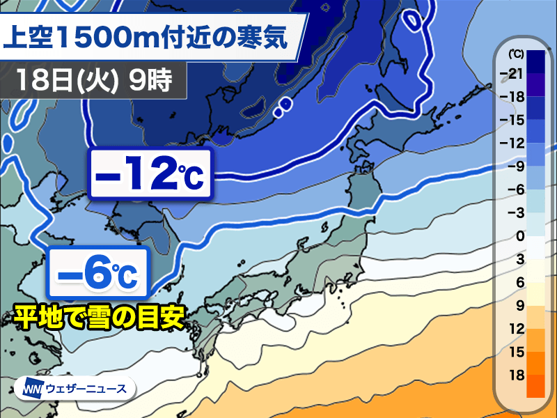来週前半は低気圧が発達しながらサハリン付近に進み、そこから伸びる前線が北日本から西日本を通過します。その後は西高東低の冬型の気圧配置が強まり、18日(火)をピークに上空には今季一番の強い寒気が流れ込む予想です。