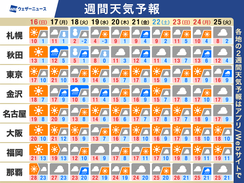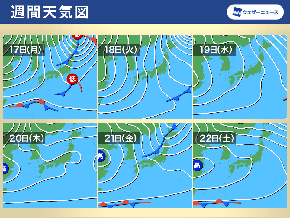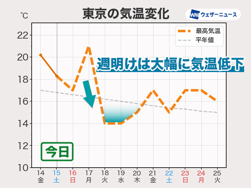 週明けは全国的に師走のような寒さになり、寒気の影響がやや遅れる関東でも、19日(水)は東京都心の最高気温は14℃と12月上旬並みの予想です。北西の季節風が強く吹くため体感温度はかなり下がるとみられます。