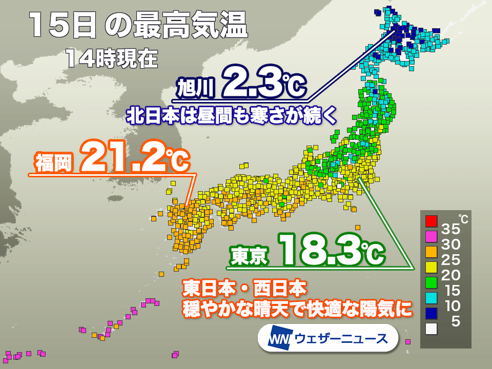 今日15日(土)は西日本や東日本は穏やかな晴天となり、各地で20℃前後まで上がりました。