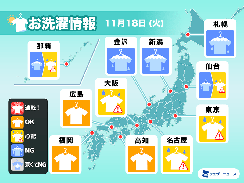 関東や名古屋周辺はすっきりしない空で雨の可能性があります。外干しは空の様子を伺いながらが良さそうです。