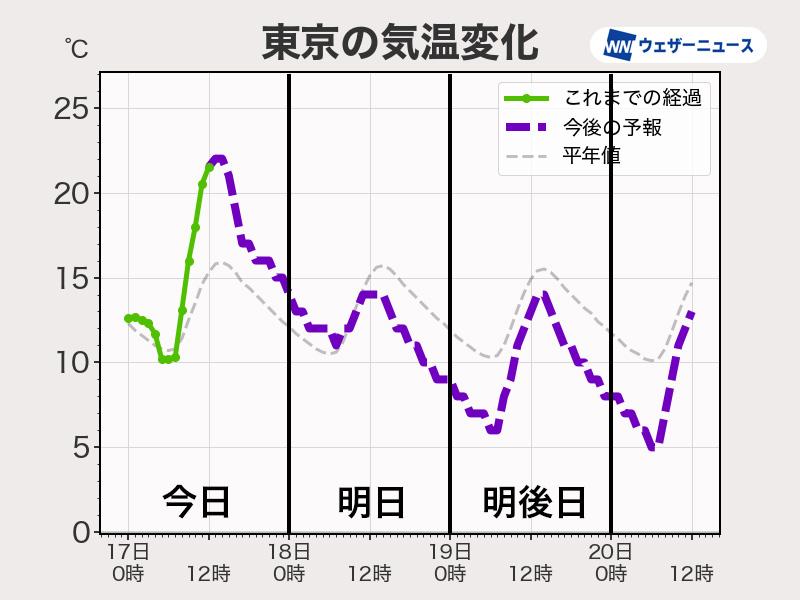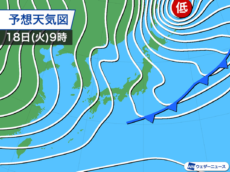 上空の寒気が南下する影響で気温が低下し、各地で明日18日(火)から気温が一気に下がります。数日で一気に2か月分くらい季節が進んだような体感変化となりそうです。