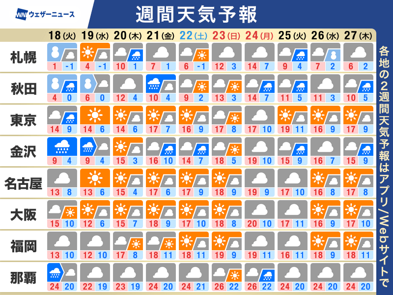 太平洋側は18日(火)以降しばらく晴れたり曇ったりで、冬にみられる天気変化となりそうです。空気が乾燥することが予想されますので、体調管理や火の取り扱いに注意してください。