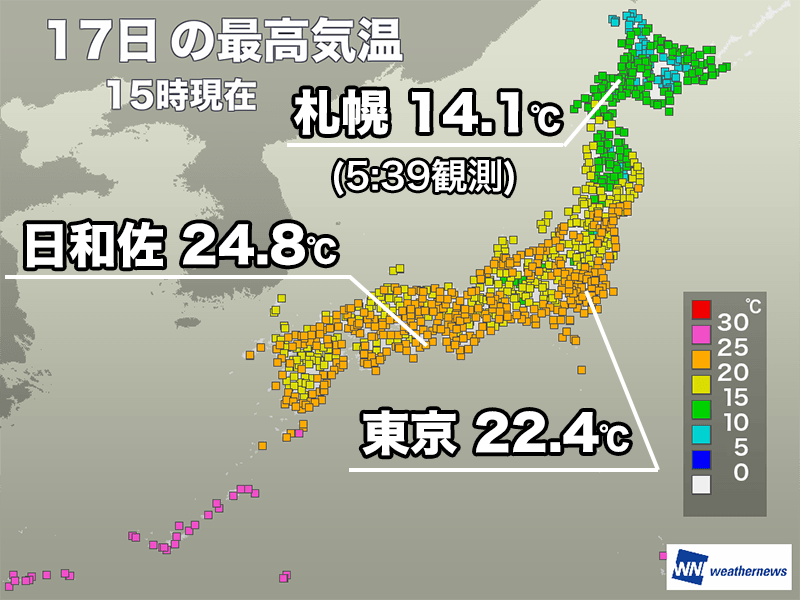 15時までの最高気温は20℃を超えた所が多く、徳島県美波町・日和佐では夏日に迫る24.8℃まで上昇。東京都心は10月中旬並みの22.4℃、仙台市は今月1日以来の20℃台となる22.1℃を観測しています。