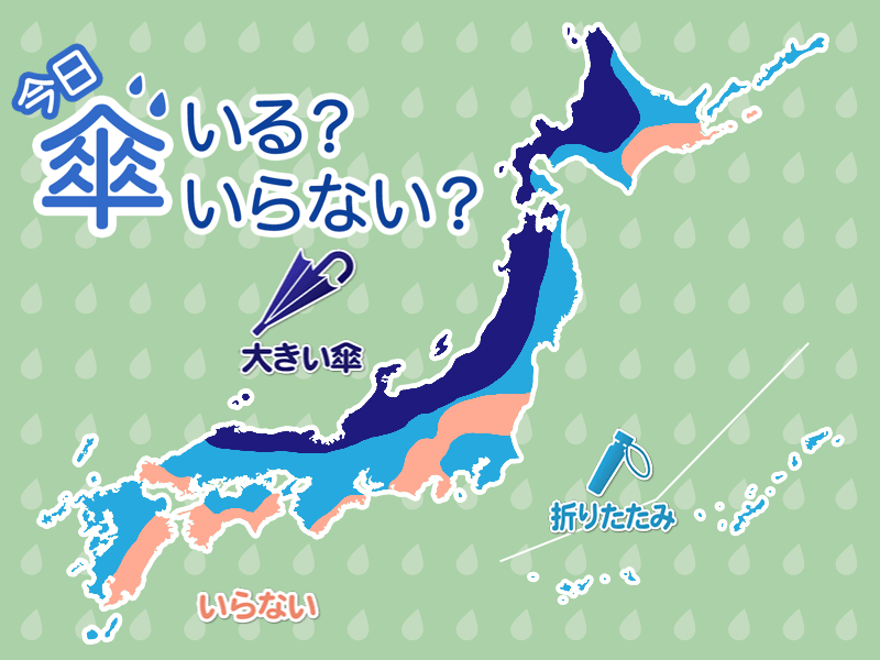 関東南部や東海、近畿の中部・南部、瀬戸内周辺でもにわか雨の可能性があるため、折りたたみ傘があると安心です。