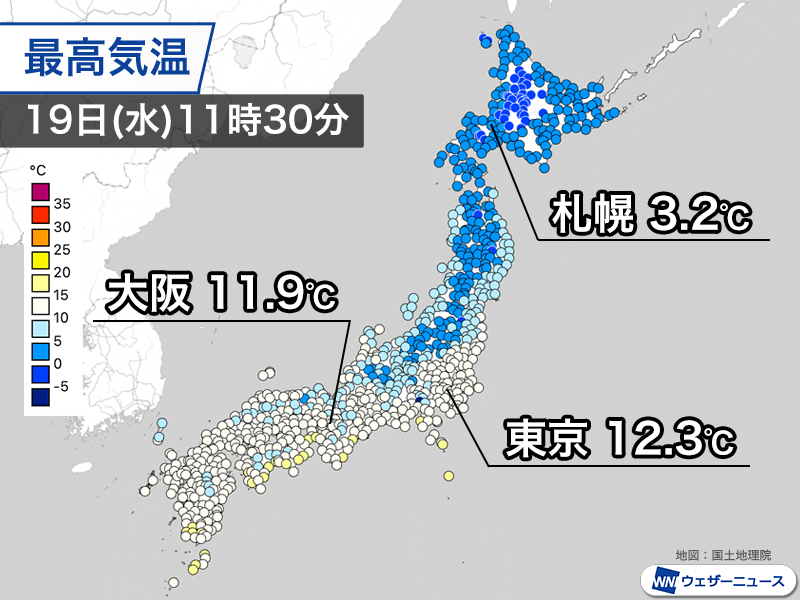 11時30分までの最高気温は東京都心で12.3℃、大阪市で11.9℃など10℃を少し上回った程度で、昨日の同じ時間帯に比べても2〜3℃ほど低めです。東京都内のウェザーニュースアプリ利用者から寄せられた体感報告では、「寒い」の回答が6〜7割ほどを占めています。