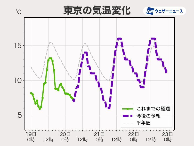 強い冬型の気圧配置はおととい18日(火)がピークで、上空にはこの時期としては強い寒気が流れ込みました。この先、冬型の気圧配置は緩むものの、地上の気温はもうしばらく低い状態が続き、12月並の寒さとなるところが多い予想です。