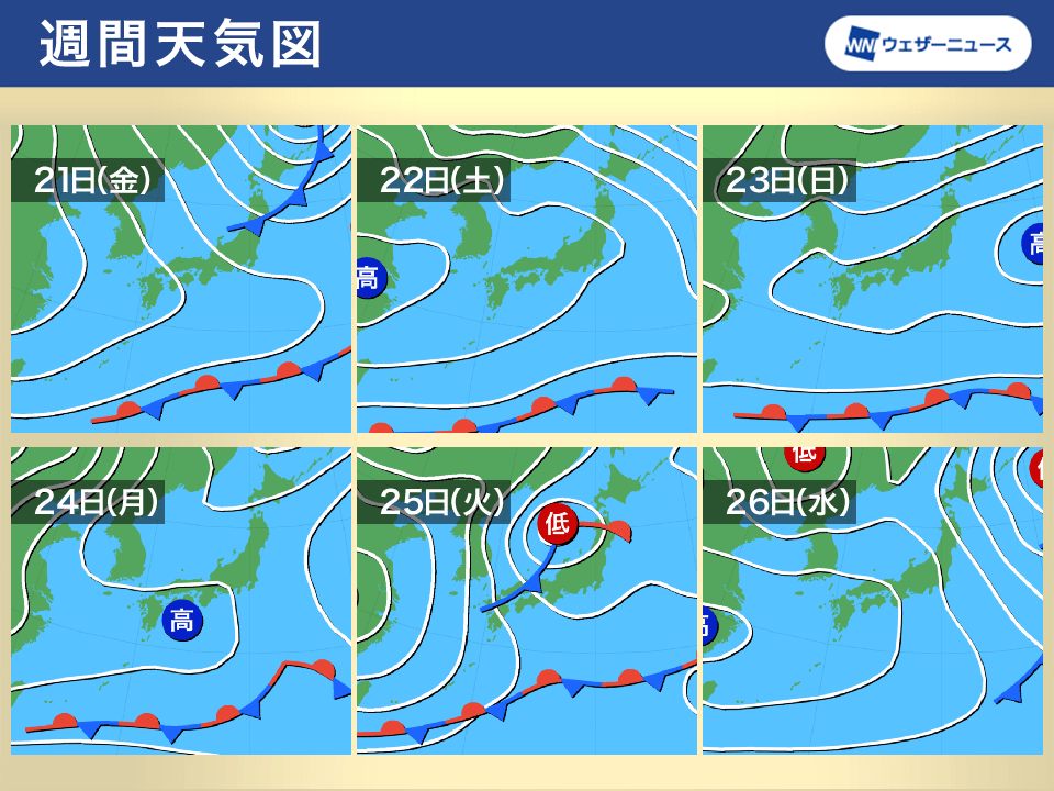 明日20日(木)夜には前線が北日本を通過し、21日(金)〜22日(土)にかけて一時的に冬型の気圧配置となります。北日本〜北陸で雨や雪が降ります。