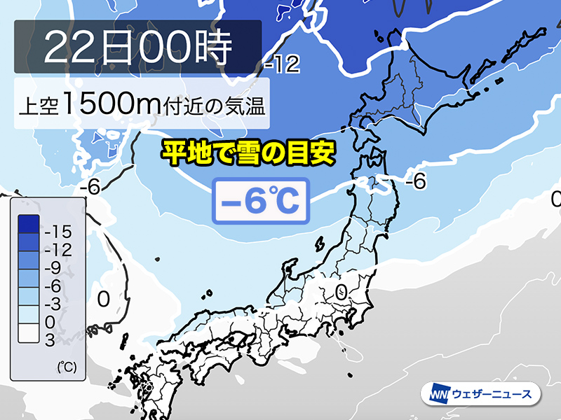 前線通過後は西高東低、冬型の気圧配置となり上空の強い寒気が流れ込みます。明日の夜遅くには平地で雪を降らせる目安の上空約1,500mで-6℃という寒気が青森県付近まで、0℃の寒気は東北南部や北陸、山陰付近まで南下する予想です。