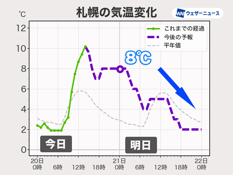 明日の札幌の予想最高気温は8℃ですが、これは日付が変わった直後の気温。気温は右肩下がりで夜は朝よりもさらに冷え込みます。