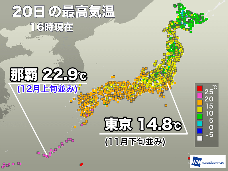 今日20日(木)はこの時期らしい気温になったところが多くなりました。15時時点で東京の最高気温は11月下旬並みの14.8℃。2日連続で15℃を下回りました。