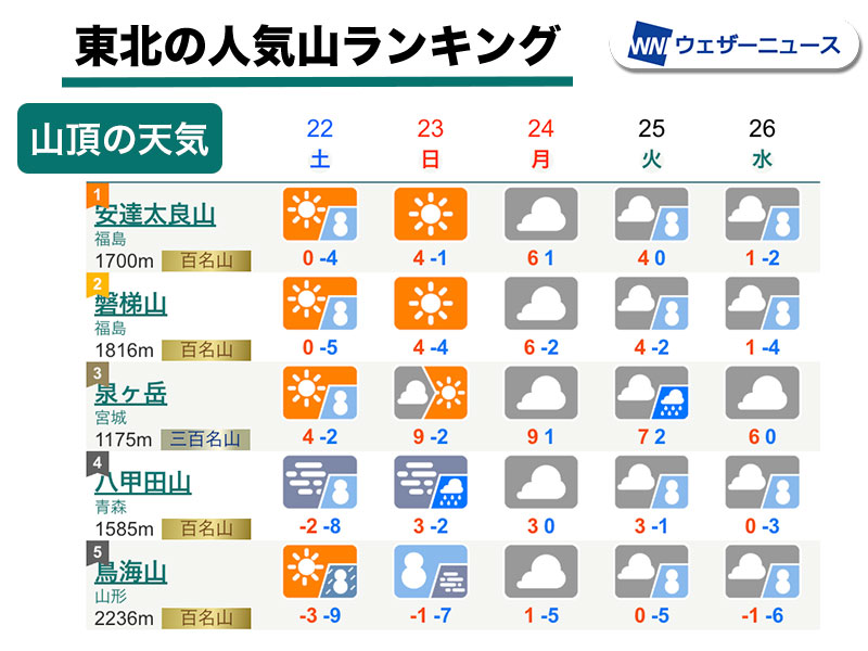前線の影響を受けにくい東北南部の山域では、薄雲の広がることもありますが大きな天気の崩れはなく、登山日和となる見込みです。