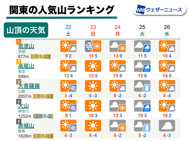 高気圧の勢力圏内となり、晴れる所が多いでしょう。房総沖を低気圧が北上しますが、千葉県や茨城県を除いて大きな影響はない見込みです。一時的に薄雲の広がることもありますが大きな天気の崩れはなく、登山日和が続くでしょう。