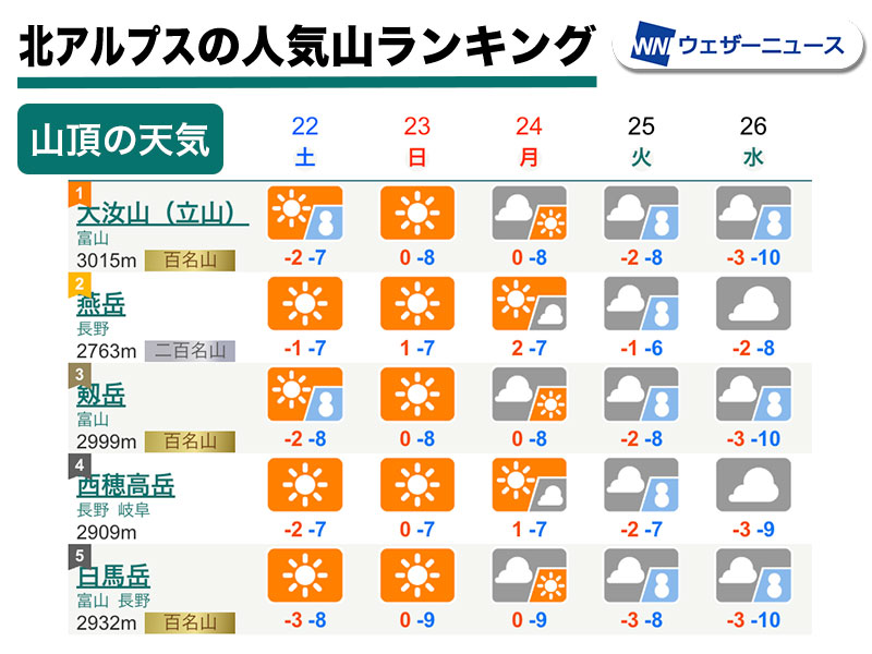 高気圧に覆われます。上空の風向きが南寄りのため、全般に晴れる山域が多くなる見込みです。薄雲が広がる時間帯もありますが、大きな天気の崩れはありません。紫外線対策を万全に。