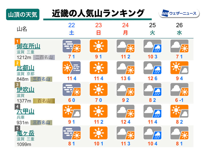 近畿地方では、日中いっぱいは登山日和が継続しそうです。