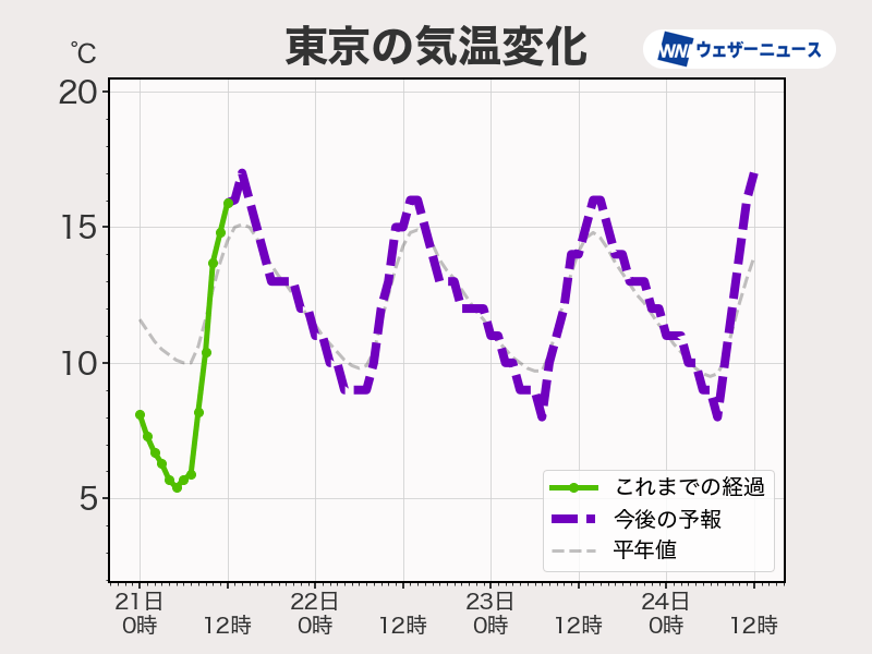 22日(土)の気温は概ね平年並みですが、23日(日)から24日(月)は気温が平年を上回るところが多くなる予想です。札幌では10℃を上回り、西日本でも20℃近くまで気温が上がるところがあります。
