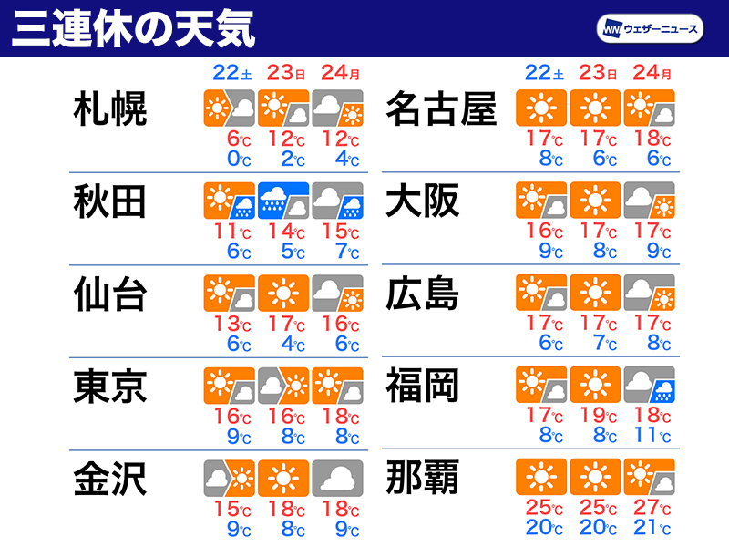 勤労感謝の日の明後日23日(日)も移動性の高気圧圏内で晴れる所が多くなります。ただ、東北日本海側や関東南部では異なる方向の風の衝突により雲が発生し、にわか雨となる可能性があります。お出かけには折りたたみ傘があると安心です。
