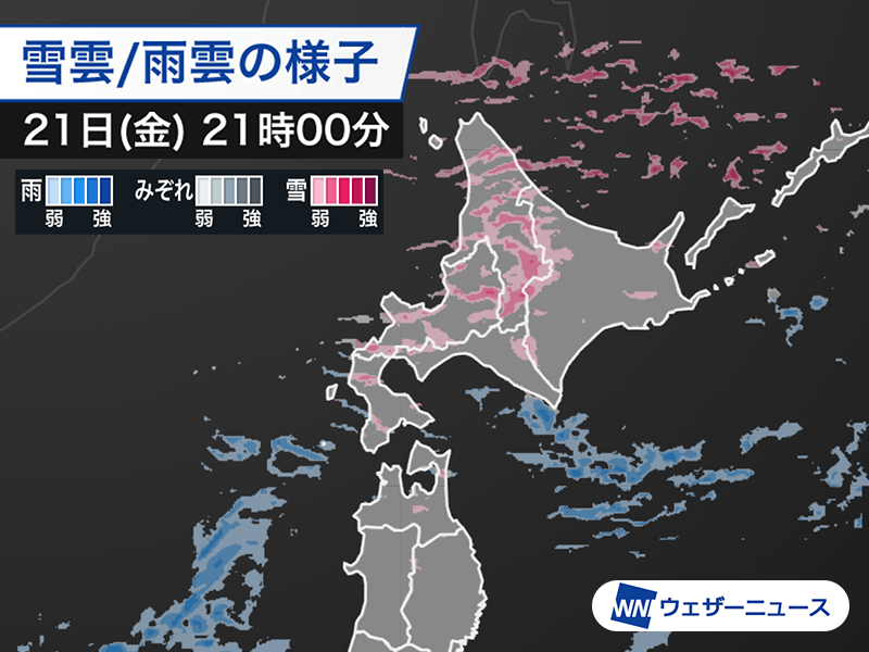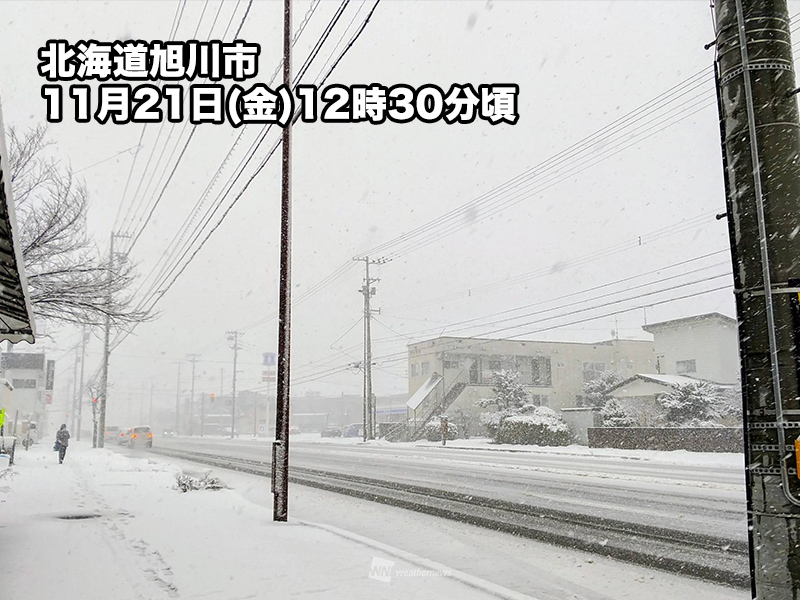 北海道では寒気の南下に伴って雨が雪に変化し、市街地でも積雪が増加。昨夜積雪が一度なくなった旭川では12時に1cm、13時には4cmの積雪を観測するなど、雪が強まり短時間で積雪が増しています。