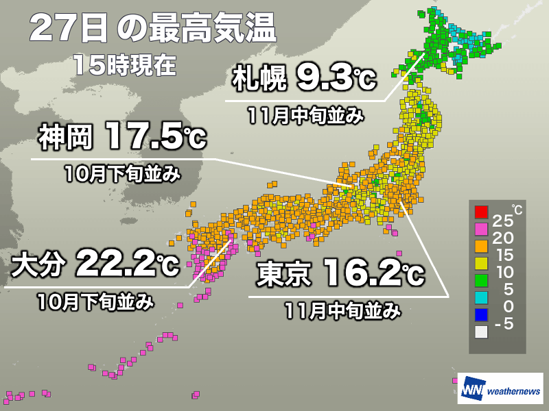 より暖かな空気に覆われた太平洋側は、20℃以上になった所もあります。大分は14時16分に22.2℃まで上がり、10月下旬並みの気温となりました。