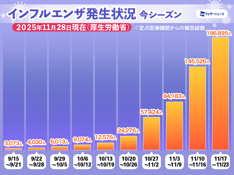 例年、インフルエンザは年末にかけて発生数が多くなる傾向にあり、今後も患者数が増加すると考えられるため注意が必要です。来週は強い寒気が流れ込み、全国的に冬の寒さとなります。また、朝晩と昼間の体感差が大きく、体調を崩しやすくなると見られます。服装や寝具を上手に調節しつつ、日頃から体調管理にお気をつけください。