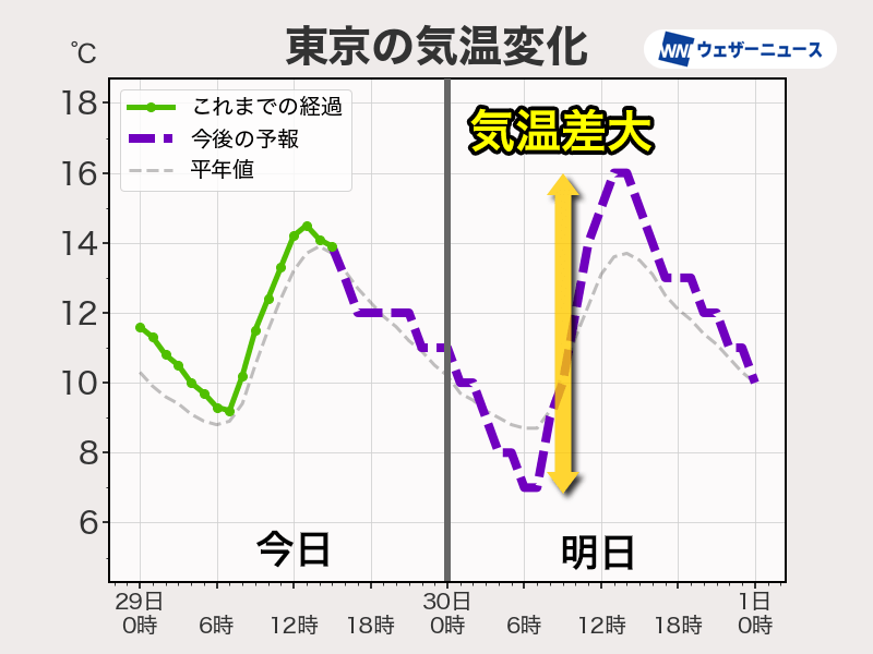 昼間は今日よりも若干気温が高めで、朝との気温差が大きくなります。服装でうまく調整するようにしてください。