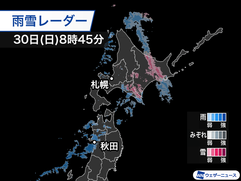 沿岸部は雨になっている一方で、内陸部では雪の所があり、8時までの1時間には上川地方の一部で1cmの降雪を観測しています。また、雨の範囲は南にも拡大し、東北北部でも一部で本降りの雨です。