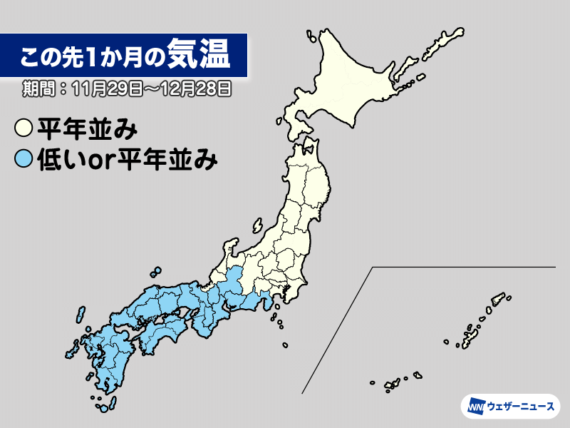 最新の長期予報では12月以降、西日本を中心に寒気が流れ込みやすい気圧配置が予想されます。この先1か月の平均気温は西日本と東海で平年並みか平年より低く、関東や北陸、北日本では平年並みとなる見込みです。