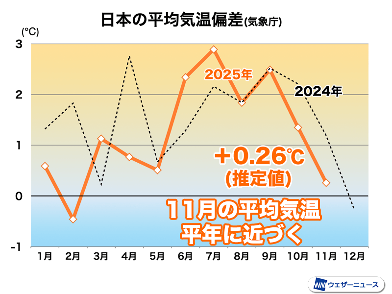 6月から続いていた基準値よりも1℃以上高い状態はようやく解消しました。11月としても基準値との差が1℃未満になるのは2021年以来4年ぶりです。