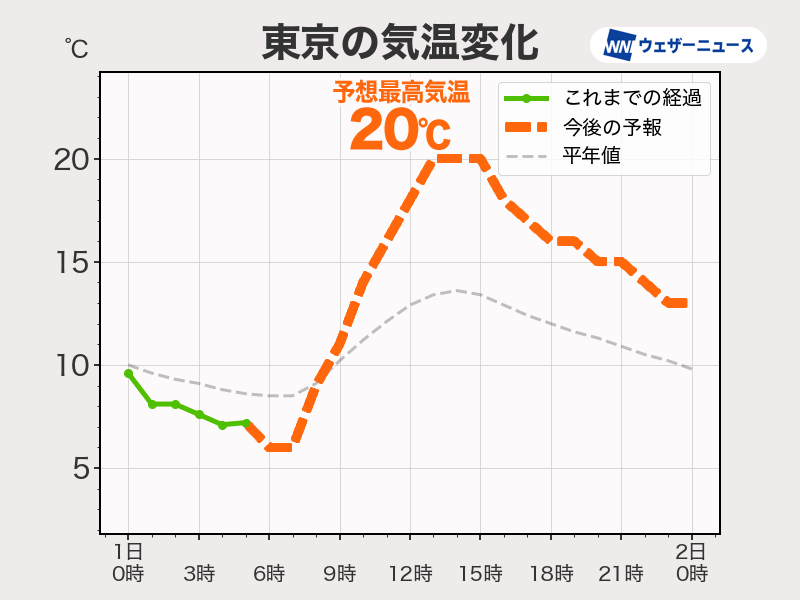昼間は20℃前後まで上昇して、過ごしやすい陽気になります。今朝は東日本で10℃を下回っているところが多く、空気がヒンヤリと感じられそうです。朝と昼間の体感温度の変化にお気をつけください。