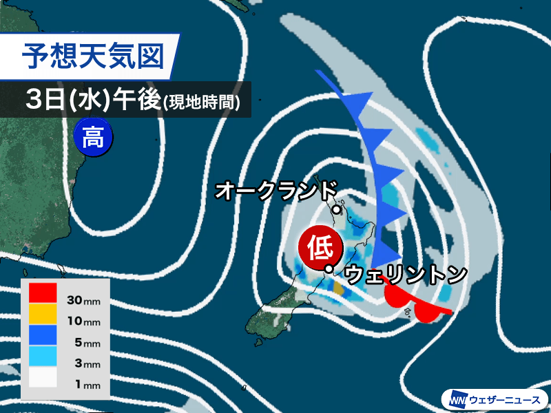 低気圧に向かって北から暖かく湿った空気が流れ込んでいるため雨雲は発達しやすい状況です。すでに北島を中心に雨雲がかかっていて、現地時間の3日(水)夜にかけて雨や風の強まるおそれがあります。