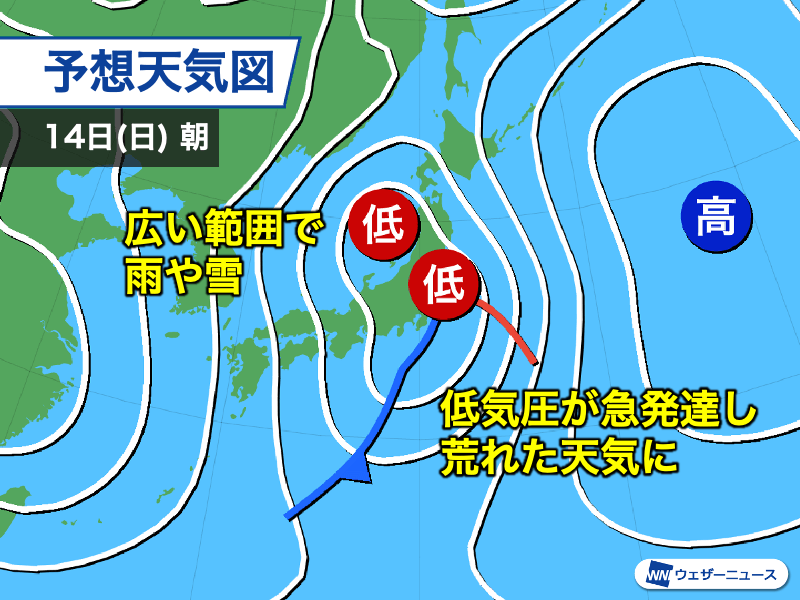 14日(日)の朝には日本海にも別の低気圧が発生し、それぞれ東に進む見通しです。2つの低気圧に伴う雲が大きく広がって、全国の広い範囲で雨や雪が降る予想になっています。