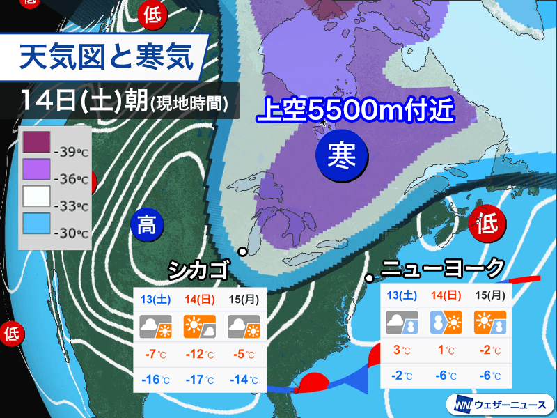 現地時間の13日(土)夜から14日(日)朝にかけて、上空5500m付近で−36℃以下の寒気が五大湖周辺を覆い、その後はニューヨークなど東海岸の上空を通過していく見込みです。