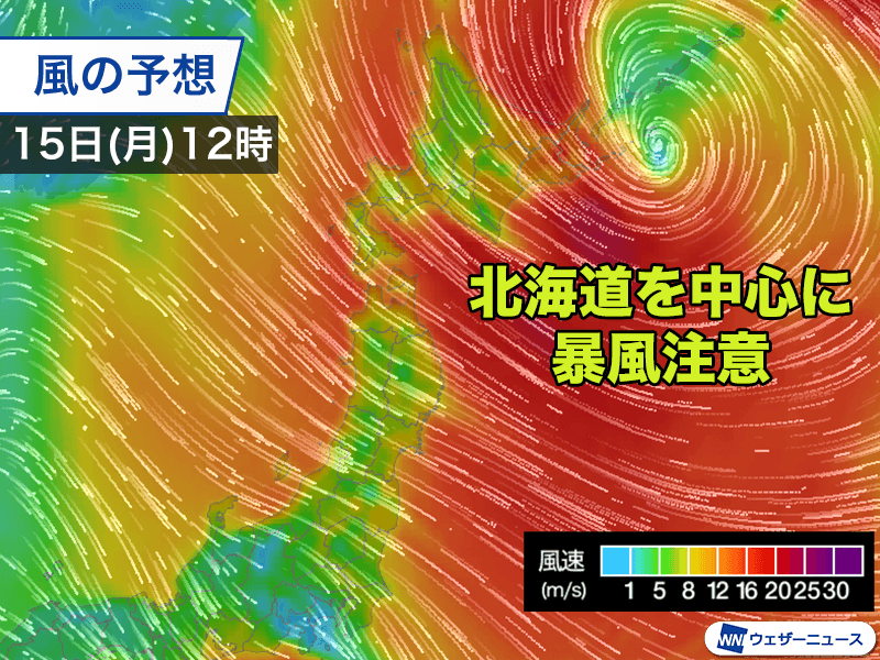 週明けの明日15日(月)は、2つの低気圧がまとまり、爆弾低気圧並みに発達しながら北東へ進む見込みです。低気圧に近い北海道や東北北部では、暴風が吹き荒れるおそれがあります。