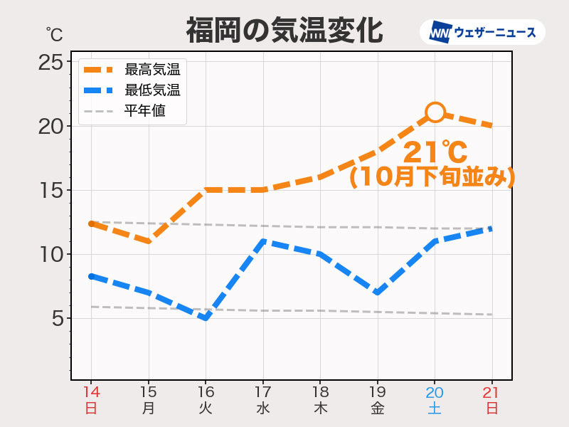 福岡では20日(土)に10月下旬並みの最高気温21℃が予想されています。1日の気温差だけではなく、日毎の気温変化にも注意をして服装を選ぶのが良さそうです。
