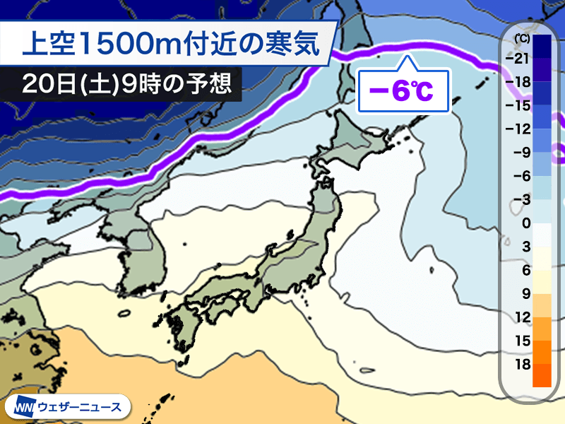 この先は、日本列島上空の寒気が徐々に北上する見込みです。平地で雪となる目安の約1500mで-6℃の寒気は20日(土)には北海道からも抜ける予想です。