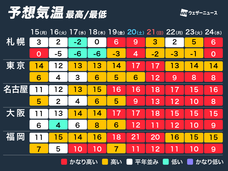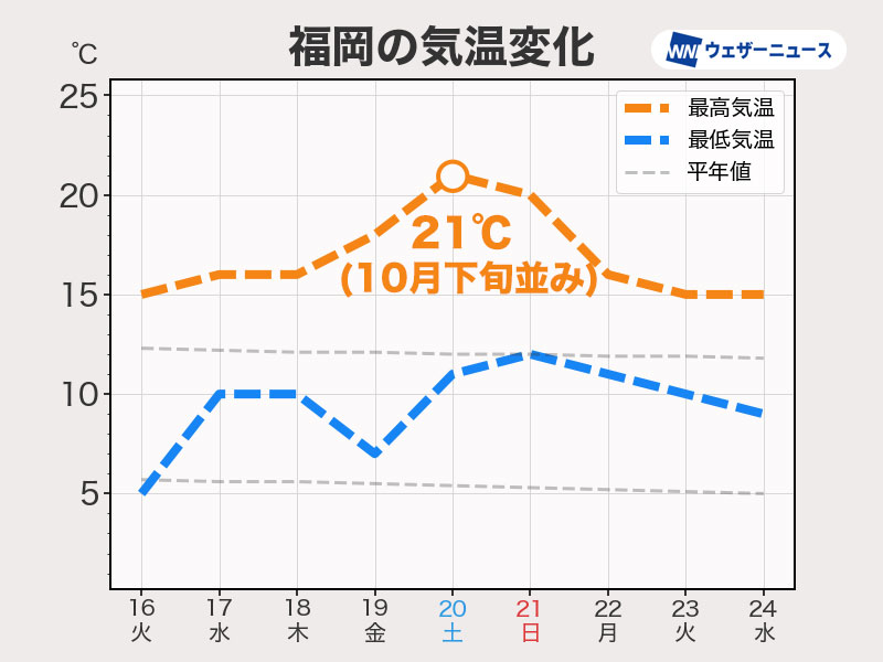 西日本では週後半は15℃を超える日が多くなり、次の週末は20℃くらいまで上がるところもある予想です。福岡では20日(土)に10月下旬並みの最高気温21℃が予想されています。東海や関東でも次の週末は17℃前後まで上がり、雲の多い空でも寒さはありません。札幌でも20日(土)は最高気温が9℃予想で、雪ではなく雨が降りそうです。