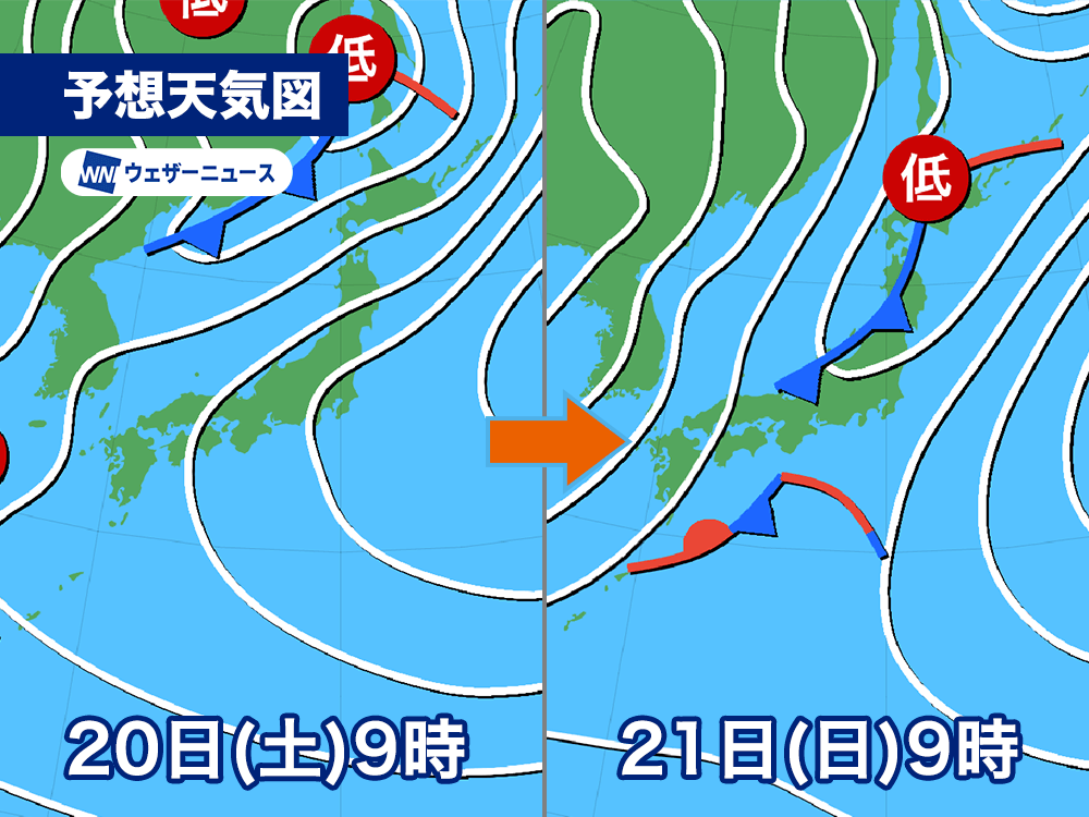 明日20日(土)は西から低気圧や前線が近づき、明後日21日(日)にかけて日本列島を通過していきます。前線に向かって南から暖かく湿った空気が流れ込むため、太平洋側を中心に雨雲が発達する見込みです。