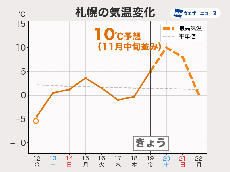 20日(土)は札幌市の最高気温が10℃、函館は13℃まで上がる予想となっています。