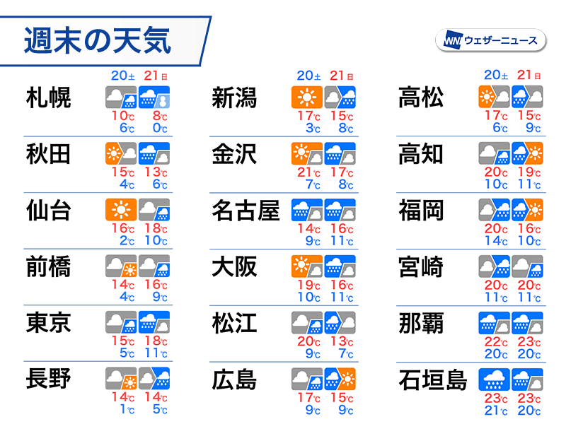 20日(土)は九州や東海を中心に、21日(日)は太平洋側を中心とした広い範囲で局地的には1時間に20mm程度の強い雨の降る可能性があります。週末は各地で傘が活躍しそうです。