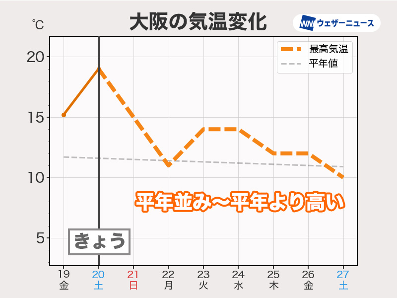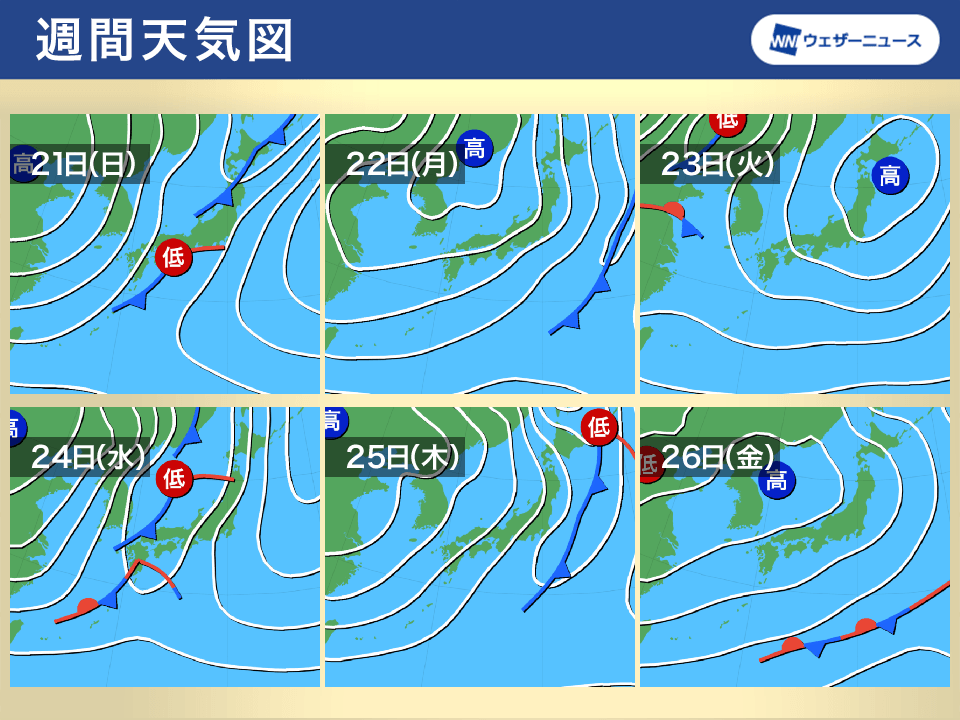 一方、22日(月)は気温が下がり、この時期らしい体感に戻ります。気温変化が大きくなるため、服装選びに注意してください。