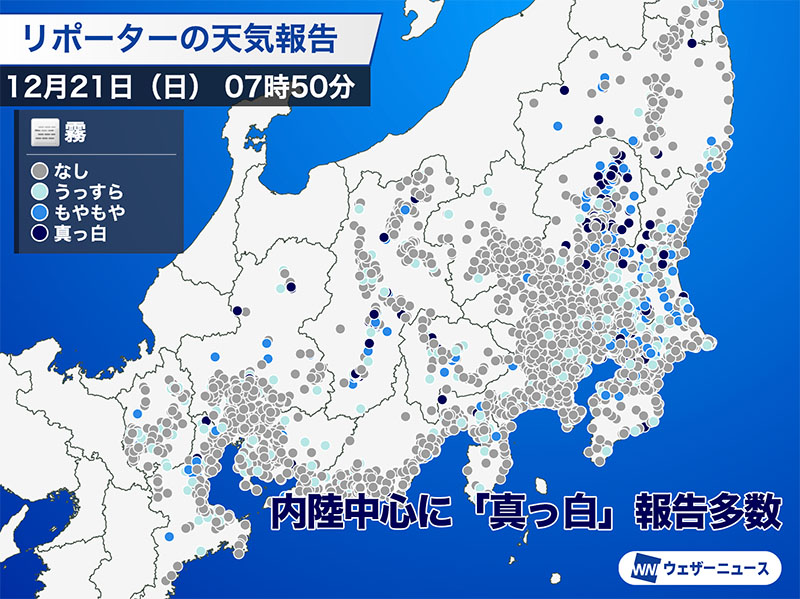 ウェザーニュースアプリ利用者からの報告によると、栃木県や茨城県、岐阜県の内陸部を中心に霧で「真っ白」との報告が多く寄せられています。
