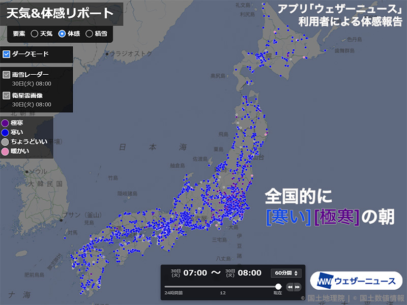 今日30日(火)の朝は、昨日よりも気温の上がった所が多くなりました。ただ、ウェザーニュースアプリ利用者からの体感報告では「寒い」「極寒」の報告がほとんどで、寒さを感じる朝となっています。