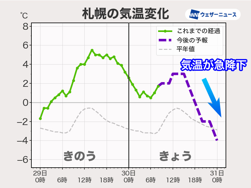 8時時点で、今朝最も低い気温となったのは北海道帯広市のアメダス帯広泉で−8.1℃(前日差+11.1℃)です。