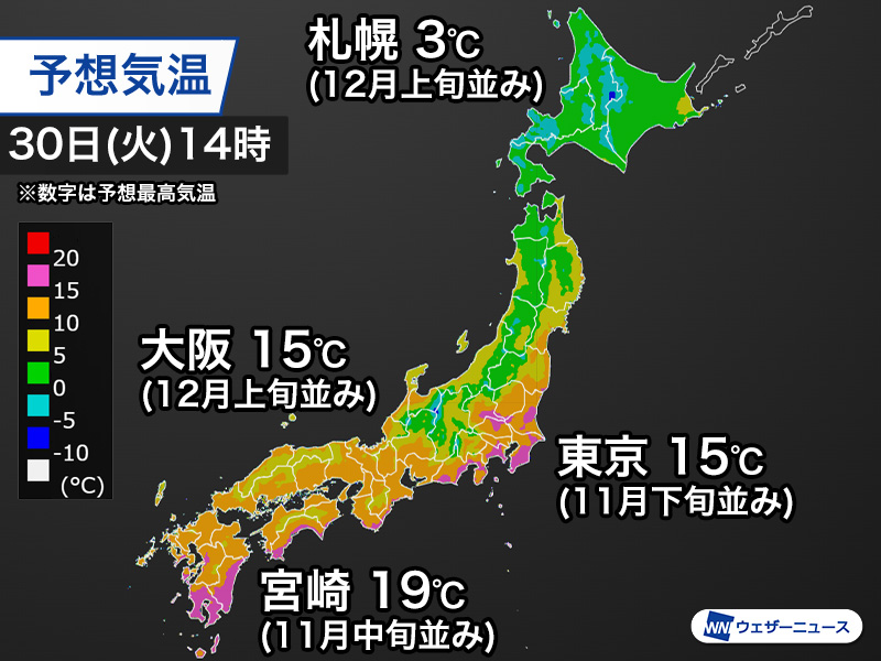 最高気温は15℃前後まで上がり、年末としては過ごしやすい陽気となる見込みです。ただ、朝晩と日中の気温差が大きいので、脱ぎ着しやすい服装で出かけるのがおすすめです。