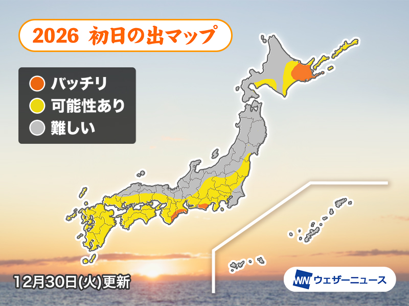 冬型の気圧配置が続くため、元旦の日の出は日本海側では楽しむのが難しく、太平洋側ほど見られるチャンスがあります。ただ、関東では沖合いから雲が広がる可能性があり、場所や時間帯によっては雲に遮られる心配があります。