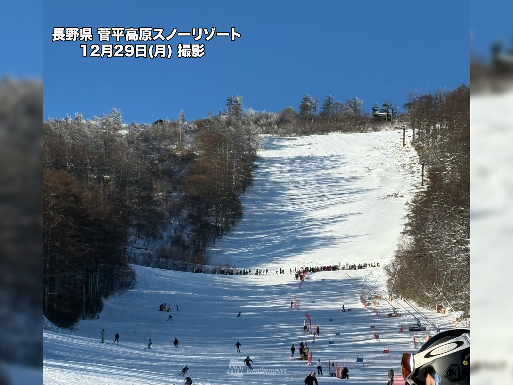 中央道沿線エリアでは、雪が降るタイミングがあるものの晴れる日もあり初滑りもバッチリです。晴れるエリアでは、サングラスや日焼け止めを塗るなど日差し対策をしっかりと行ってください。