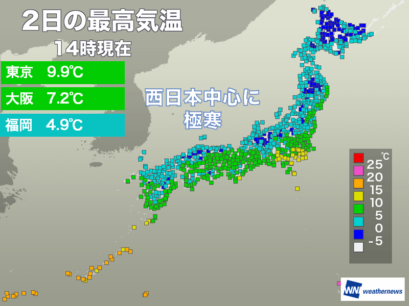 今日1月2日(金)14時までの最高気温は、鹿児島5.8℃、福岡4.9℃、松山5.9℃、広島6.2℃、大阪7.2℃です。西日本は都市部でも雪の舞った所があり、最高気温は5℃前後と非常に厳しい寒さとなりました。
