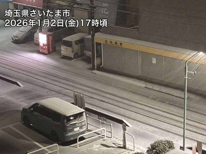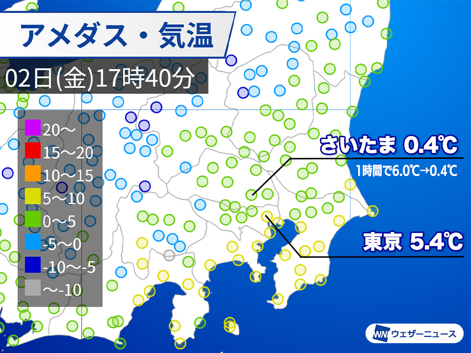 さいたま市周辺など、南関東の平地でも雪になっている所があります。17時40分の東京都心の気温は5.4℃と高いものの、降水が開始したさいたま市は0.4℃まで下がっています。