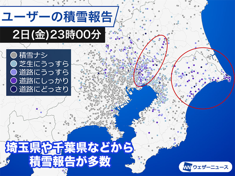 ウェザーニュース会員から寄せられた積雪の報告では、埼玉県南部、東京都と千葉県の境界~茨城県つくば市方面にかけての地域、千葉県北東部で道路に積もっている報告が目立ちました。